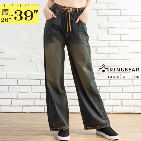 【N117】修飾腿型高腰鬆緊抽繩布標設計復古直筒長褲/牛仔寬褲