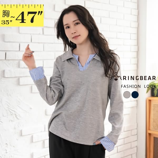【X676】清新文藝休閒條紋拼色翻領百搭假兩件長袖上衣