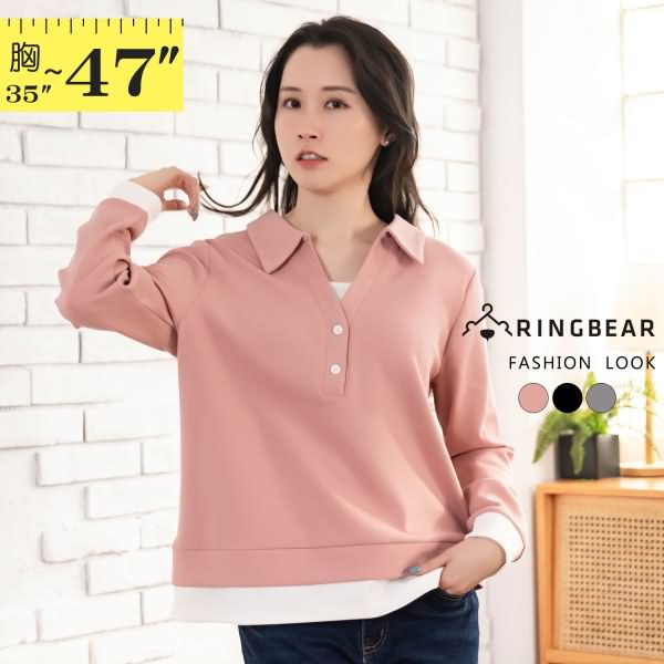 【X669】低調氣質撞色羅紋翻領裝飾釦假兩件長袖上衣