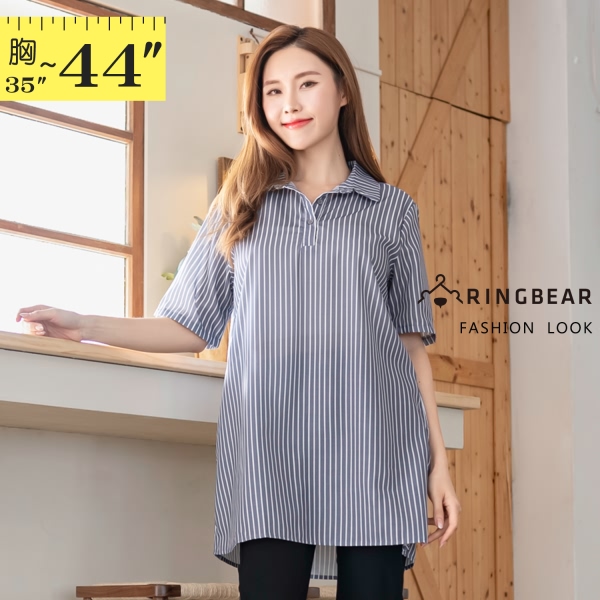 【H210】韓版條紋寬鬆顯瘦襯衫領短袖長版上衣
