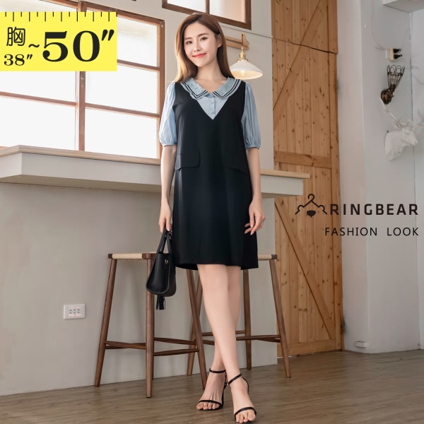【D642】甜美氣質蕾絲緹花邊娃娃領排釦撞色拼接短袖連衣裙