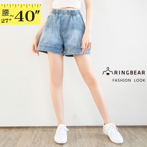 【R289】帥氣拼接剪裁復古刷色中央壓線設計鬆緊高腰牛仔短褲