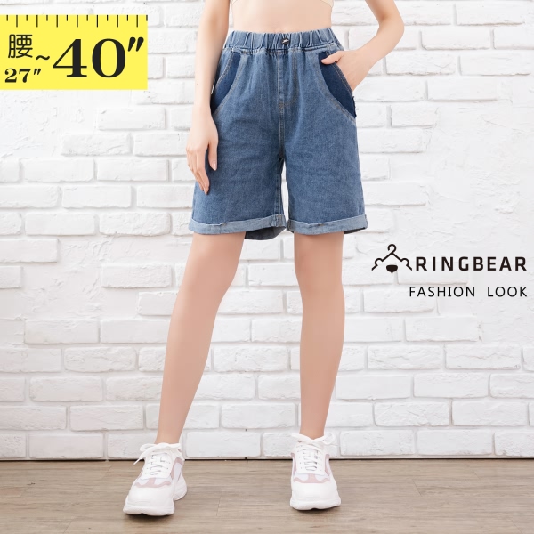 【R290】率性百搭高腰鬆緊口袋異色拼接下擺反摺五分牛仔褲