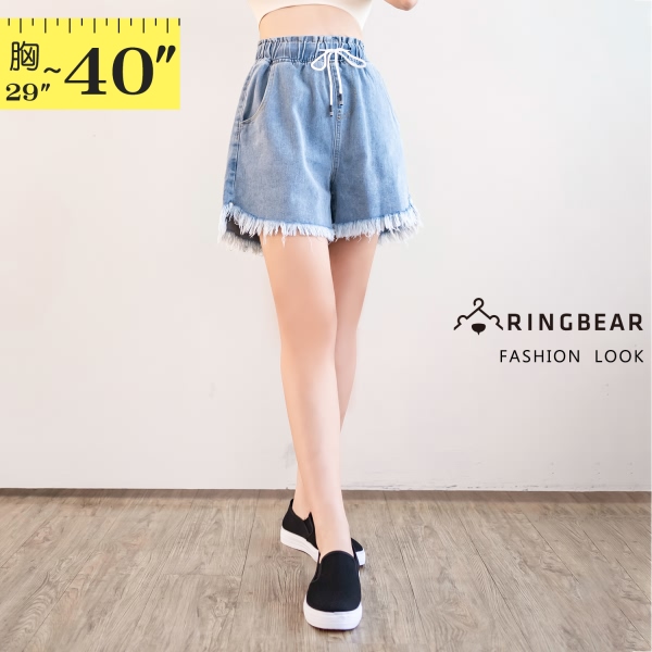 【R291】百搭潮感抽繩綁帶鬆緊腰頭褲腳抓鬚休閒牛仔短褲