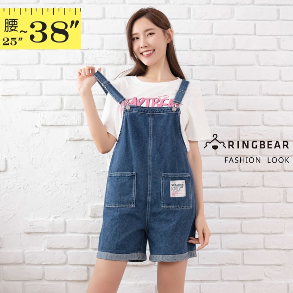 【R297】可愛俏皮滿點撞色縫線顯瘦褲腳反摺寬鬆連身吊帶牛仔短褲