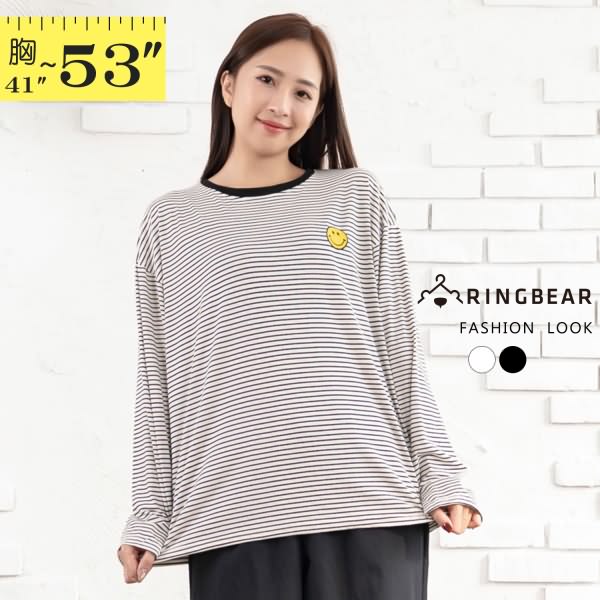 【X686】律動美感休閒刺繡笑臉條紋寬鬆圓領落肩長袖T恤